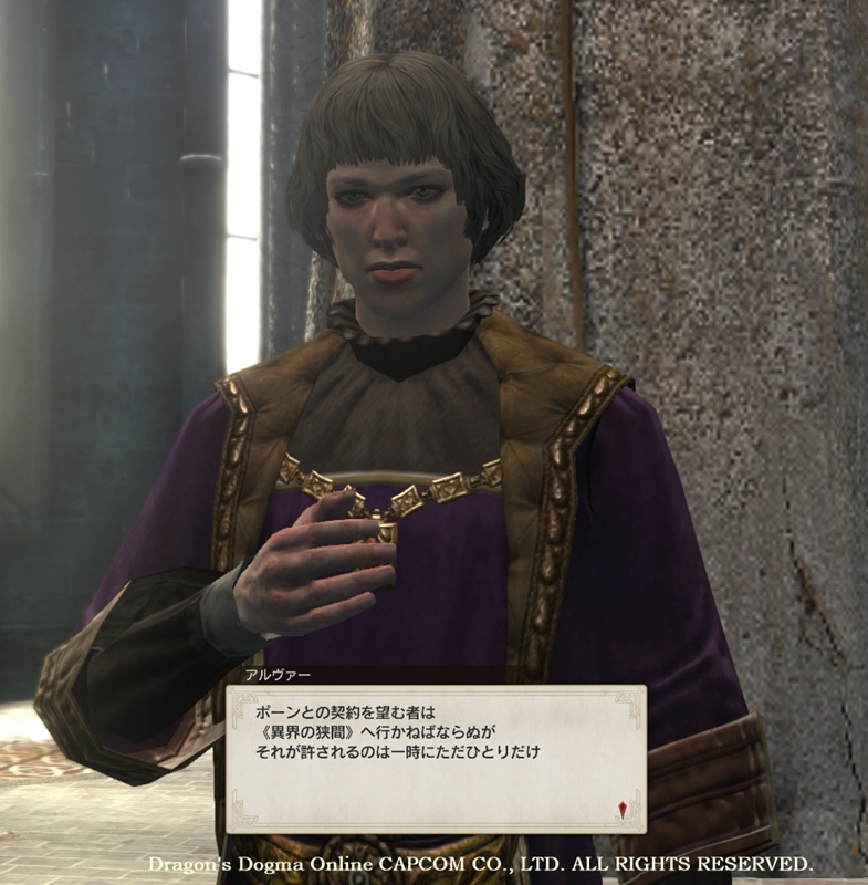 色々(本当に色々)あった、最初のお使い。 どうにかクリアして戻ってきたら。 金髪お兄さんがこんなことを言ってきました。 次のイベントのはじまりのようです。 言われるままにイベントを進めると、まず最初に解説があります。 異界から現れ、覚者様に従う存在、それが戦徒。 要はPCをサポートするNPCってことですね。 PSO2で言う「サポートパートナー」と同じような存在。 戦徒とパーティを組み、ソロ活動する方が多いという話も耳にします。 契約するためには戦徒の故郷「ポーン郷」に行く必要があり。 そこでは里長さんから、更に解説をされます。 戦徒は、実は不死身であるとか。 個人(?)の意思は持ってないとか。 主人である覚者様には絶対服従だとか。 …まあ。サポートNPCが反乱起こしたら、それはそれでドラマです。 で。お約束と言うか、何と言うか。 契約のための試練とやらを受けることになりました。 試練はひとりで臨まなくてはならず、出始めとしては不安が残ります。 初期イベントとはいえ、此方は未だ要領がよく判っていません。 (加えて。プリーストって攻撃力あんまり高くないですし) 結果、途中で彷徨えるポーンさんに一回ノックアウトされ…(遠) それでもどうにか、最奥部へたどり着き、必要アイテムを入手。 戦徒をお迎えすることになりました。 戦徒の名前は「Conrad(コンラッド)」です。 由来は、PCと同じくバレエ(及び物語詩)の「海賊」より。 ヒーローである、海賊さんのお名前をいただきました。 戦徒には、口調の設定をすることができますので。 「海賊だから」と言う理由で「ワイルド」な口調にしました。 当然ながら(何)最大身長の210cmです。 その後のヘルプ画面(?)によると。 ・初期状態(?)で契約できる戦徒は二人(後に枠1つ追加あり)。 ・戦徒とパーティを組んで冒険に出かけるのが基本スタイルのひとつ。 ・戦徒には「クラフト」を頼むことができる。 ・自分以外の覚者様の戦徒もレンタルすることができる。 大体、こんな感じの解説が。 1人目の戦徒と契約した暫く後から、やたらと出て来たメッセージです。 2人目の戦徒との契約も、さっさとしなさい、と言うことでしょうか? こちらは、レンタルでお手伝いをお願いした、別の覚者様の戦徒さん。 自分たちよりも少しばかりレベル高めの方をお招きしました。 戦徒にクラフトを頼むイベントなどもあったりします。 この時は、指輪を作るのが課題でした。 そして。戦徒と契約したら、自分のお部屋を貰えます。 (パートナー指定した戦徒と一緒に生活する場所ってことらしいです) 必要最低限の家具しかなく、がらんとしていて、寂しい感じですが。 それなりに広くて、まあ、中々良い感じです。 お部屋の中では、パートナー指定した戦徒が歩いたり座ったりと。 PR コメントを投稿する